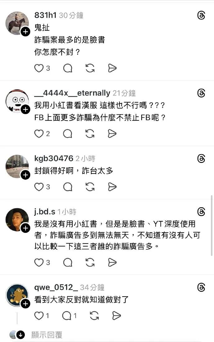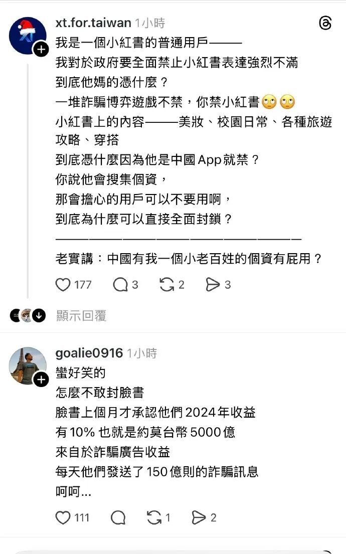所以,当台当局以“国家安全”为由封禁小红书的时候,台湾网友第一反应不是拍手叫好,而是困惑、不满,甚至嘲讽:“封小红书能减少诈骗?那为什么不把民进党一起封了?”“连生活方式都怕,那你们到底在怕什么?”